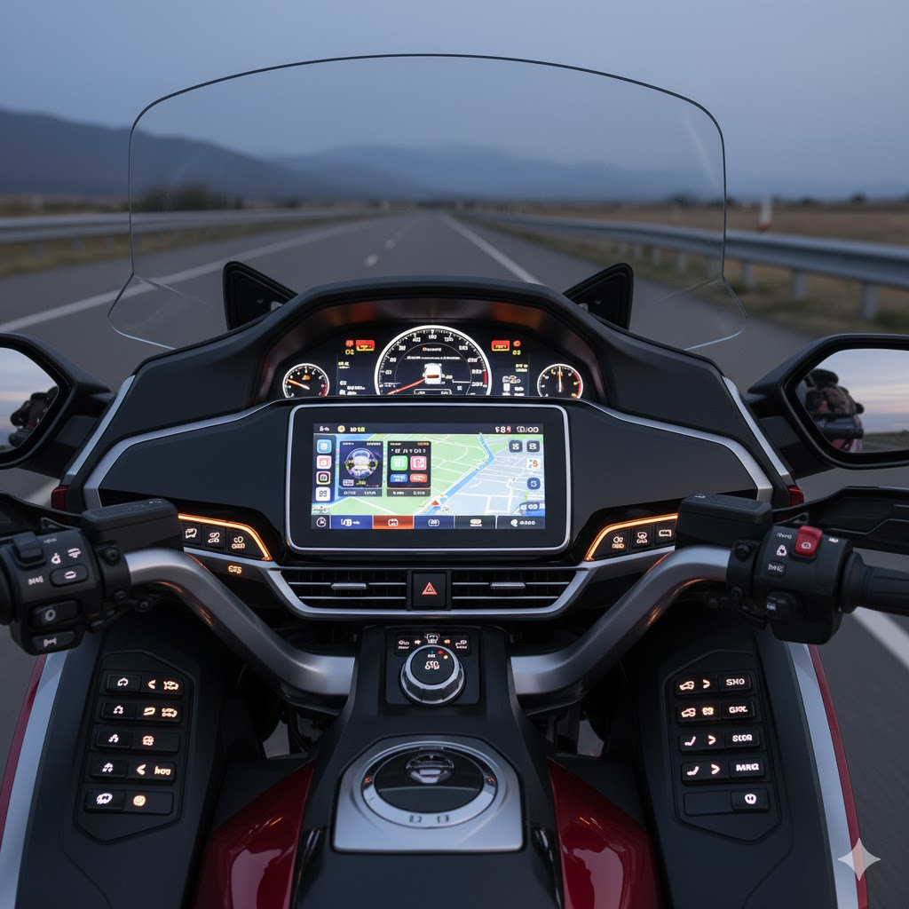 Honda Gold Wing sudah mendukung konektivitas penuh. Pengguna dapat menikmati musik, navigasi, dan panggilan telepon langsung di layar TFT. Semua bisa diatur dari setang.